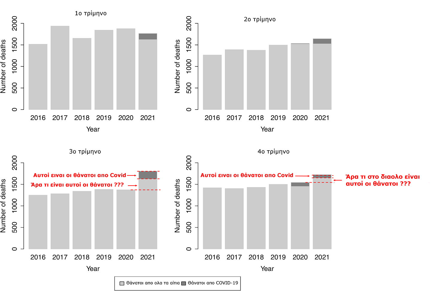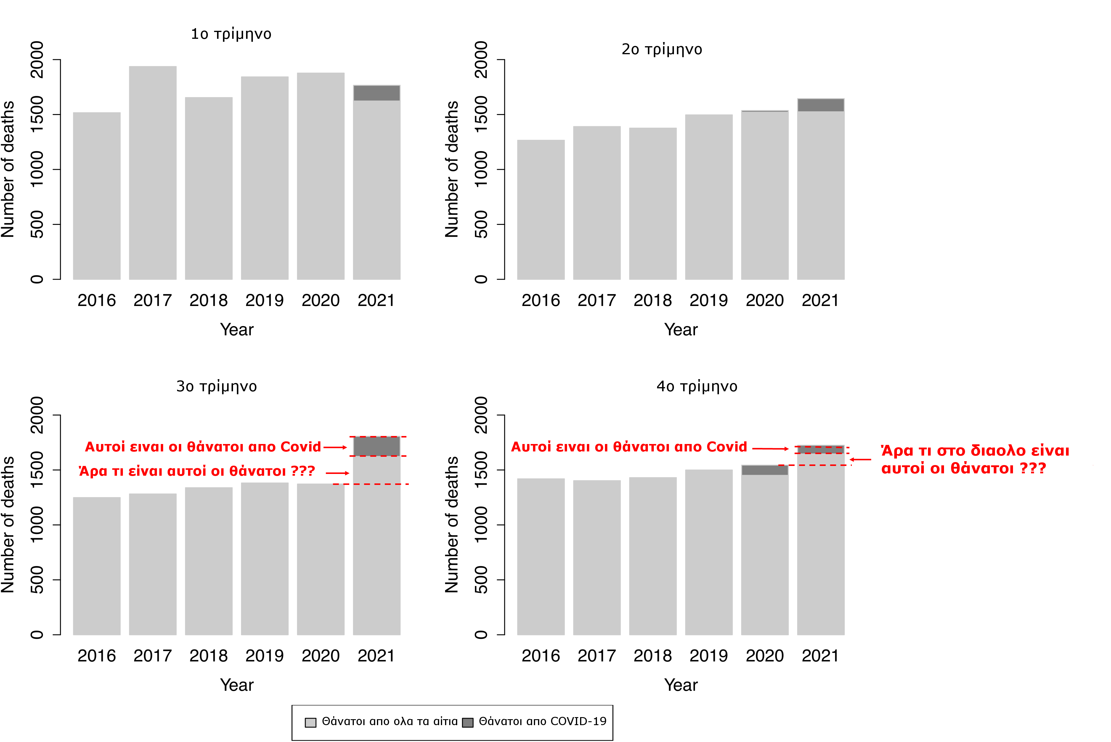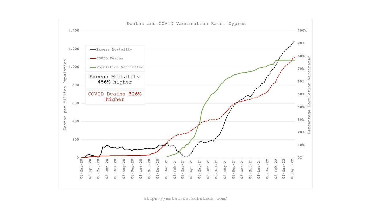Τώρα έχουμε ανεβασμένες τιμές θνησιμότητας από όλα τα αίτια στην Κύπρο (και όχι μόνο στις ΗΠΑ και την ΕΕ) το 2021 που ήταν η χρονιά που χορηγήθηκαν τα εμβόλια. Είναι ιδιαίτερα επιβαρυμένη η θνησιμότητα στο 3ο και το 4ο τρίμηνο (πιθανότατα λόγω των ενισχυτικών δόσεων).