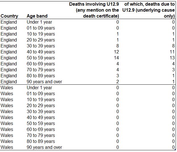 Δημιούργησαν έναν πίνακα με τίτλο «Εμβολιαστικοί θάνατοι 2013 - 2021», ο οποίος απαριθμούσε στατιστικά στοιχεία θνησιμότητας για τους θανάτους στην Αγγλία όπου η υποκείμενη αιτία ήταν ο εμβολιασμός (εξαιρουμένων των εμβολίων για τον COVID-19). Το απόλυτο σύνολο των θανάτων μεταξύ 2013 και 2021 ανήλθε σε έναν. Ένας θάνατος από το ιογενές εμβόλιο που συνέβη το 2018.
