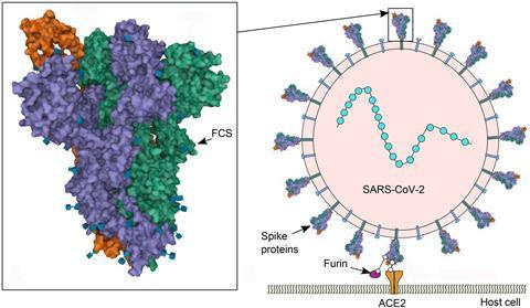 Η παρακάτω εικόνα απεικονίζει τον ιό Sars-Cov-2, τις Πρωτεΐνες Ακίδας (Spike Proteins), Τη Φουρίνη και τη Θέση Διάσπασης Φουρίνης (FCS) που βοηθά τον ιό Sars-CoV-2 να επιτεθεί στα κύτταρα και τον υποδοχέα ACE2 των κατάρων όπου προσκολλάται η Πρωτεΐνη Ακίδας για να εισέλθει ο ιός στο κύτταρο.